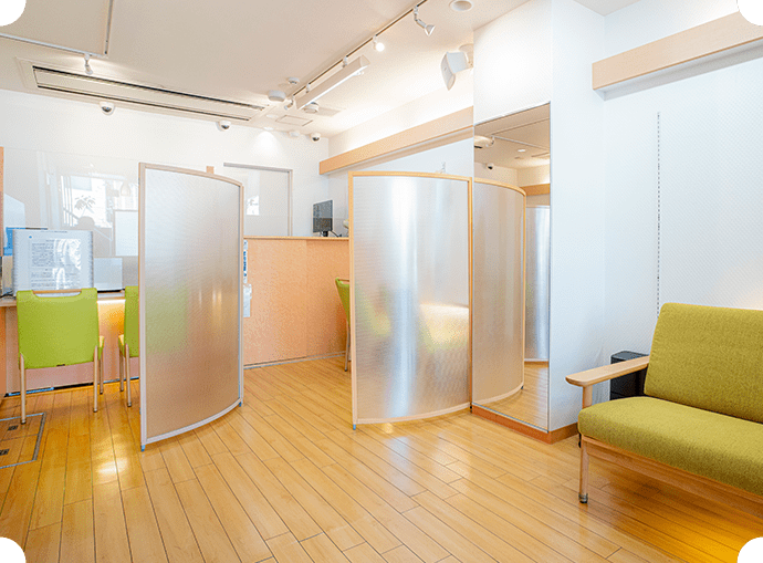 内装は明るい木を基調としたあたたかみのある雰囲気。接客スペースでは仕切りがあり、他のお客様から見えにくくなっております。